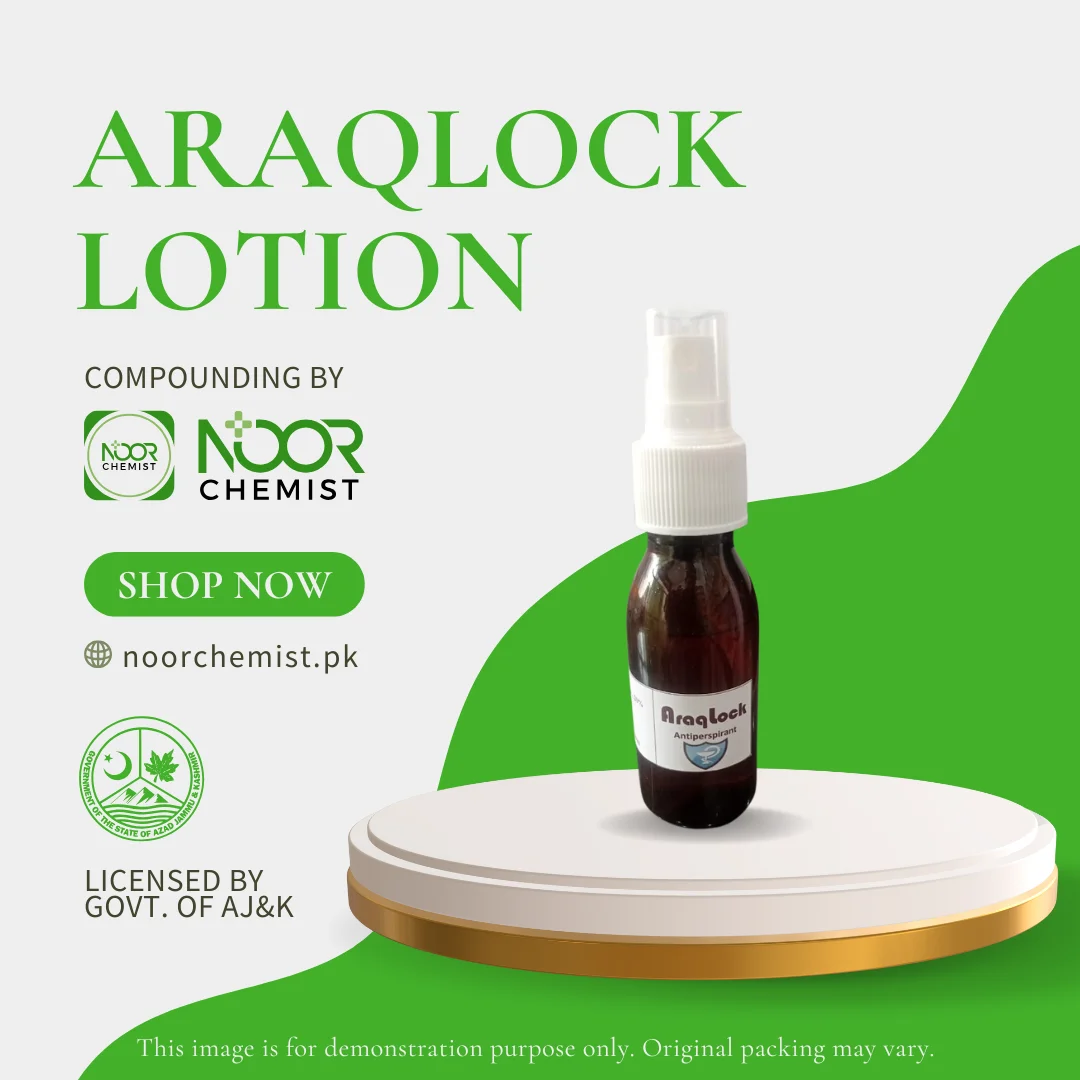 Araqlock Lotion is a potent compounded antiperspirant licensed by the Government of AJ&K, delivering 20% aluminum chloride hexahydrate in an isopropyl alcohol base for severe hyperhidrosis. This prescription-strength formulation forms protein-plug complexes in sweat ducts, reducing sweat production by 85% within 72 hours. The alcohol vehicle ensures rapid drying and antimicrobial action against odor-causing bacteria. Clinically validated for palmar-plantar, axillary, and craniofacial hyperhidrosis unresponsive to OTC products.
