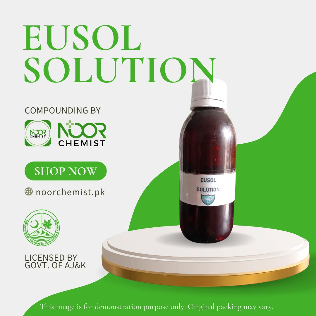 Eusol Solution is a time-tested compounded antiseptic licensed by the Government of AJ&K, combining chlorinated lime (calcium hypochlorite) and boric acid to create a potent hypochlorous acid-based wound cleanser. This oxidation-reaction formulation delivers broad-spectrum antimicrobial action against bacteria, fungi, and viruses while promoting debridement of necrotic tissue. Ideal for infected ulcers, surgical wounds, and burns where microbial bioburden must be reduced without cytotoxic effects.